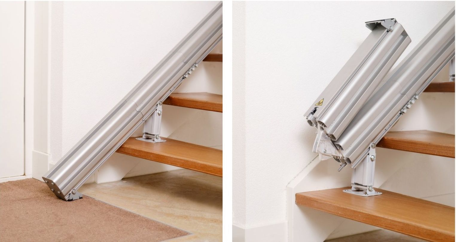 Die Schiene des Up Treppenliftes lässt sich mit einer Klappschiene versehen.