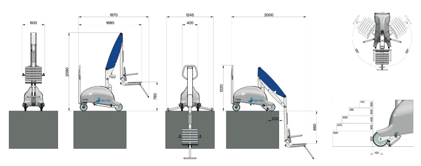 zur Seite drehbaren Hebearm (250°) kann der Lift für das Umsetzen in den Poollift an seiner Position verbleiben.