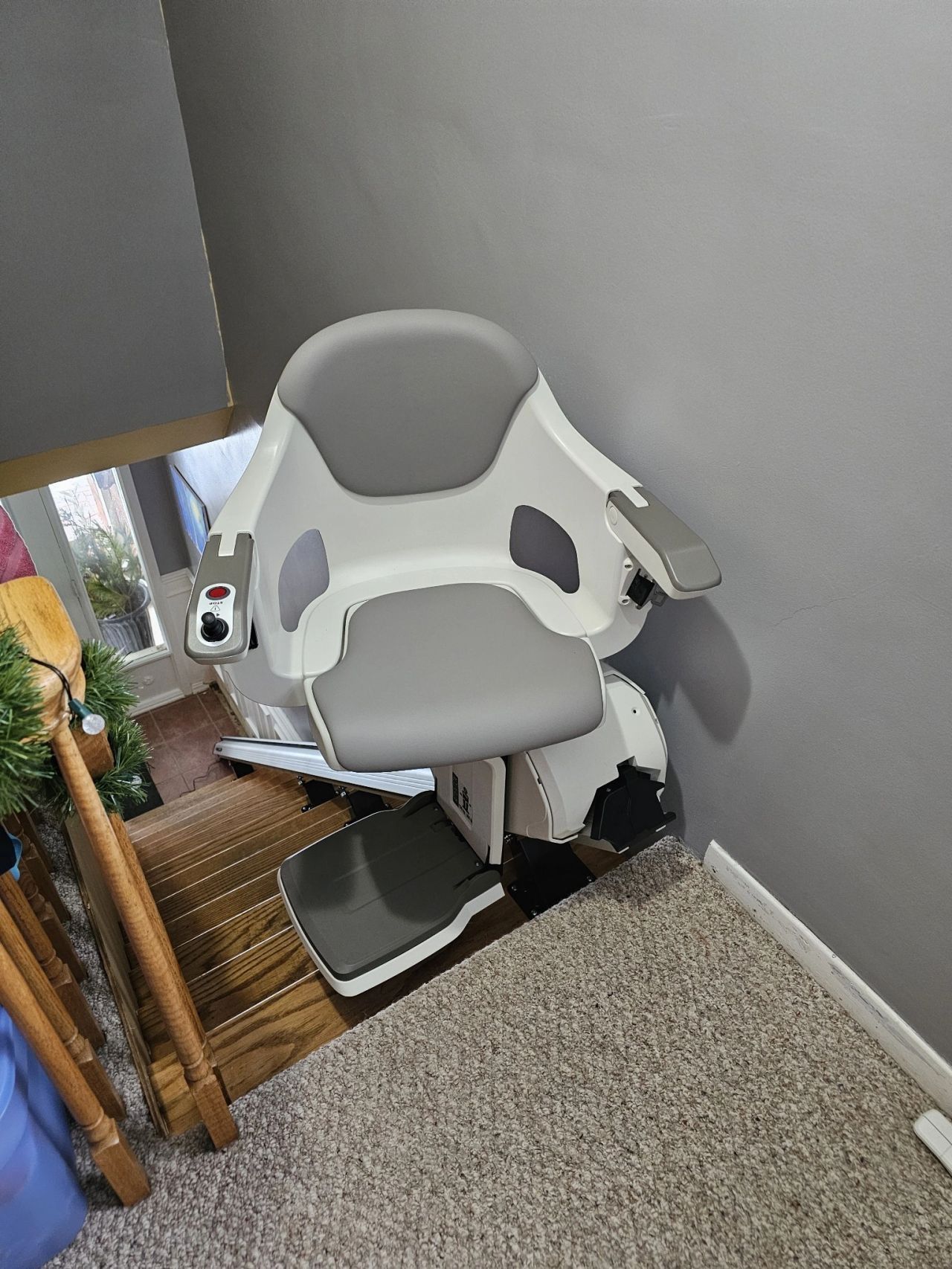 Mit dem sehr gut positionierten Bedienhebel lässt sich der Treppenlift unkompliziert steuern. Einfach in die Richtung drücken, in die man fahren möchte.