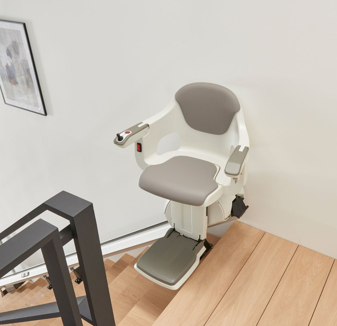 Wenn der Treppenlift nicht benötigt wird, lässt sich der Stuhl, die Armlehnen und das Fußteil hochklappen.