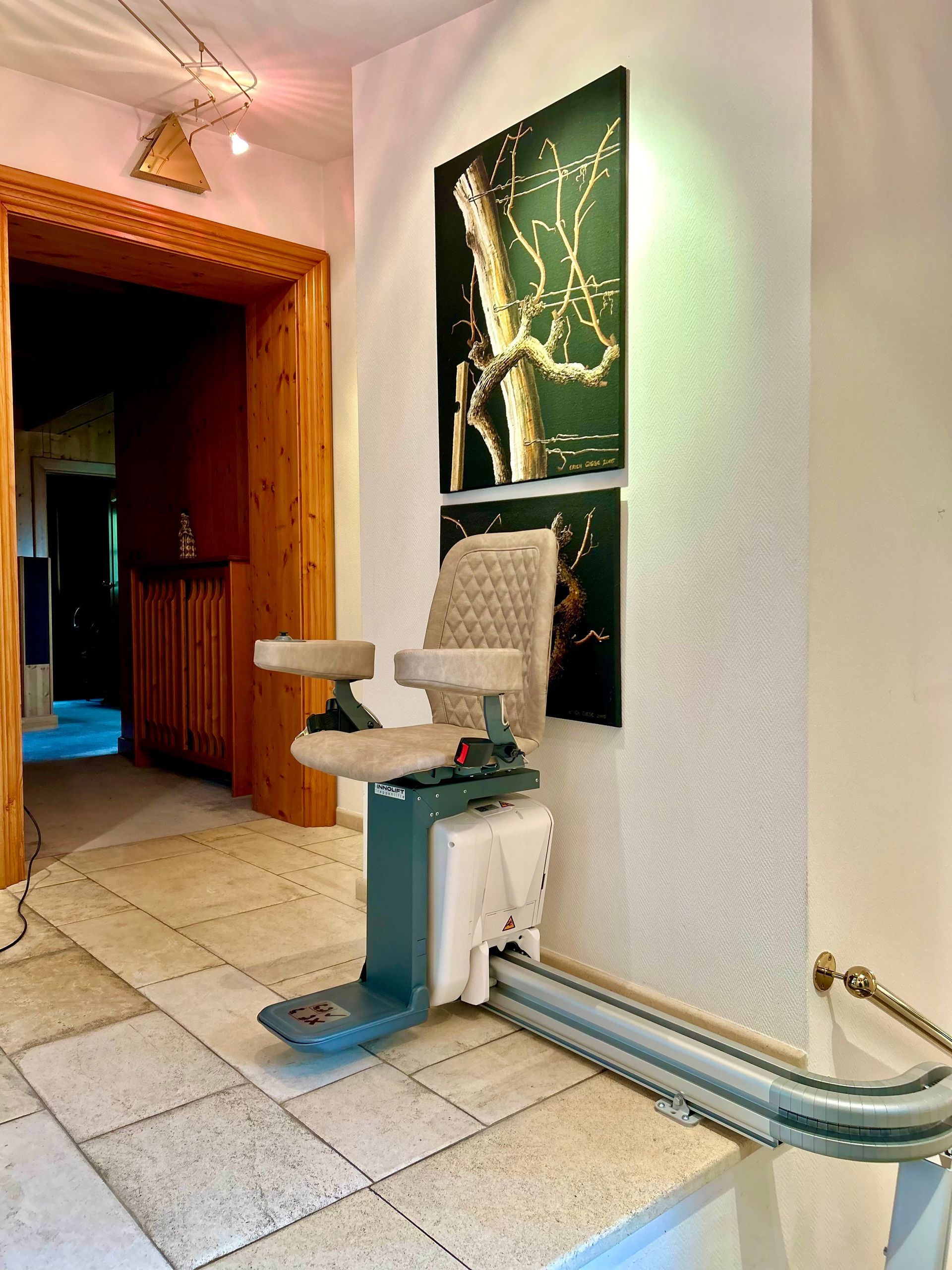 Durch die hochwertigen Materialen und die schlanke Formgebung fügt sich der UP Treppenlift dezent in jede Einrichtung ein.